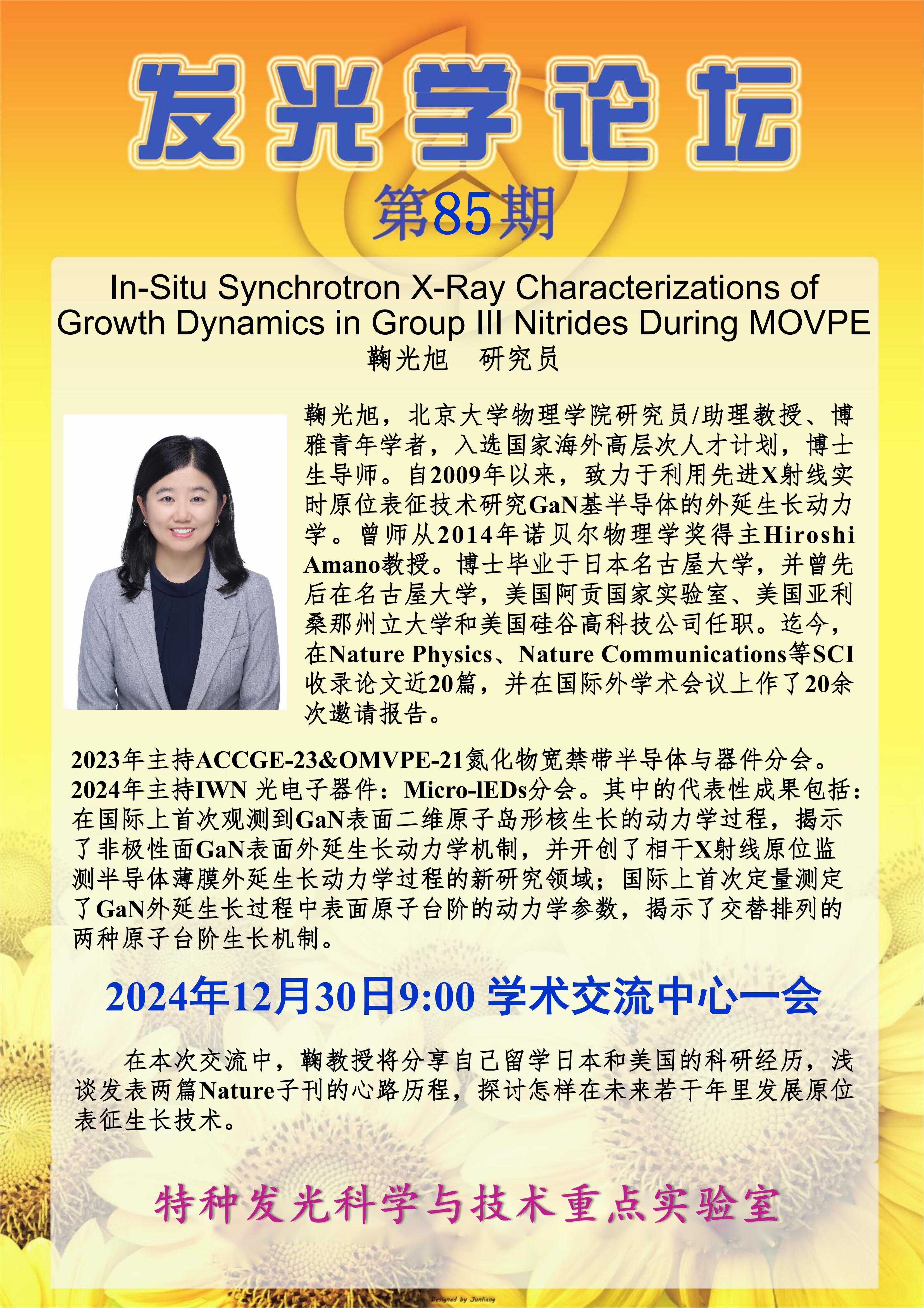 发光学论坛第85期:In-Situ Synchrotron X-Ray Characterizations of Growth Dynamics in Group llI Nitrides During MOVPE