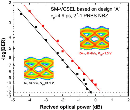 针对这一问题,特种发光科学与技术全国重点实验室Bimberg中德绿色光子学研究中心团队提出基于氧化孔径优化、光子寿命调控、增益腔模失配的VCSEL设计方法,获得高速单模VCSEL芯片,提升调制带宽并降低功耗,实现100m光纤条件下基于NRZ调制60Gb/s无误码传输速率,功耗98fJ/bit@50Gb/s、168fJ/bit@60Gb/s,指标达同类型器件国际先进水平。