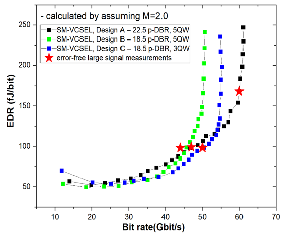 不同设计的VCSEL的功耗与传输速率的关系,VCSEL功耗100fJ/bit@50Gb/s、168fJ/bit@60Gb/s。