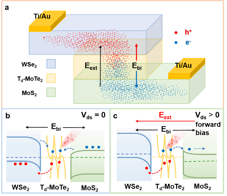 为解决上述难题,研究团队设计了PMN双肖特基异质结。该结构的核心优势在于其在MoTe2沟道层两侧形成了两个背对背的肖特基势垒。这一架构产生了协同增强效应:首先,双势垒极大地抑制了载流子的自由扩散,将暗电流从微安量级(10-6 A)压制至亚皮安量级(10-13 A),降幅达7个数量级。其次,由能带弯曲产生的内建电场与外加电场协同作用,不仅有效分离了光生电子-空穴对,还驱动它们分别向WSe2和MoS2层快速定向传输,显著降低了载流子复合概率,从而实现了偏振信号的高效提取。