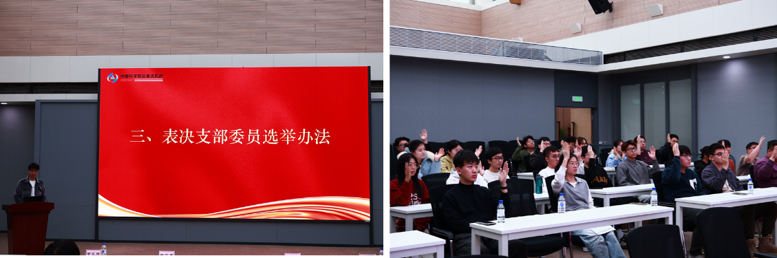 会议第三项议程,审议并表决《光学室学生第一党支部支部委员选举办法(2026版)》。刘斌同志详细解读了选举办法的制定依据、任职条件、选举流程、投票规则等核心内容,说明该办法是会前支部委员会充分调研、广泛征求意见、反复研讨后形成的草案。在充分讨论环节,与会党员踊跃发言,提出合理建议,支委会现场回应并说明。随后,大会以举手表决方式进行表决,与会有表决权党员一致赞成通过该选举办法,为支部换届选举工作的规范有序开展奠定了坚实基础。