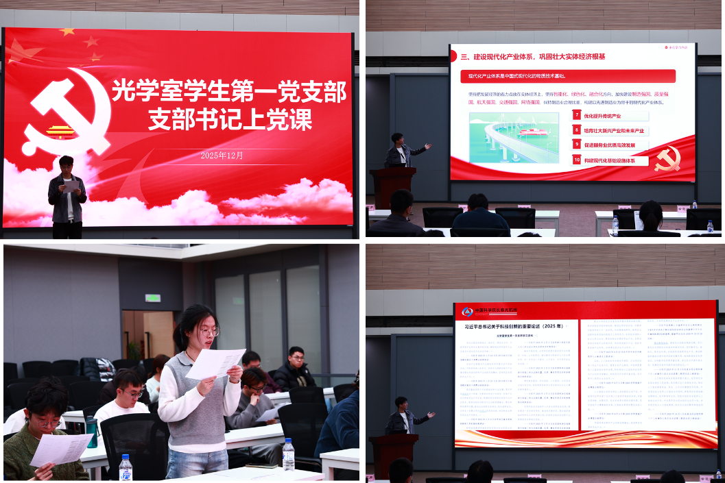 在专题学习环节,刘斌同志以 "深学细悟新思想 科技创新勇担当" 为题讲授党课,组织全体人员集中学习党的二十届四中全会精神及 2025 年习近平总书记关于科技创新的重要讲话精神。为提升学习实效,支部会前已召开党小组会,围绕学习内容开展预讨论并整理形成专题学习教材。党课上,刘斌同志结合支部科研工作实际进行重点导读,深入阐释了党的二十届四中全会关于党的建设、科技创新的重要部署,系统解读了总书记重要讲话中 "科技自立自强" 的核心要义。在交流研讨环节,学生党员与积极分子结合科研实践踊跃发言,分享学习感悟,纷纷表示要将理论学习成果转化为攻坚克难的科研动力,立足光学领域深耕细作,为国家科技创新事业贡献青春力量。