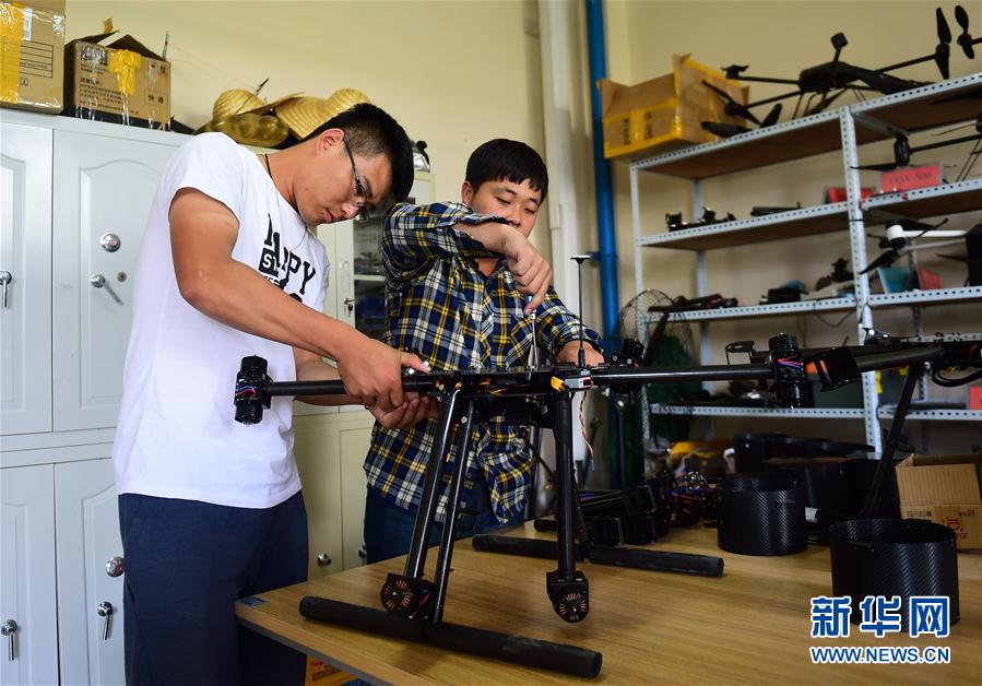 5月31日,两名长春光机所无人机研发团队技术员在进行一台无人机的整装和调试。