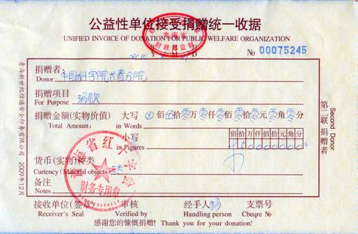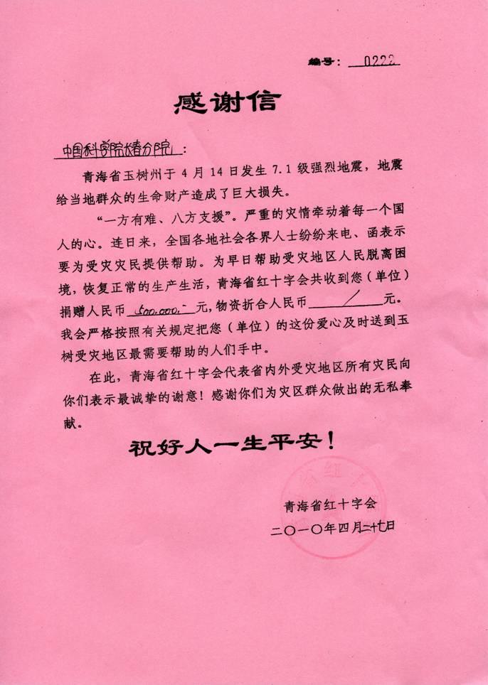 截至4月23日,长春分院各所站及分院机关干部职工已捐款668679元。在中科院西北高原生物所及昆明分院的积极帮助下,其中,50万元已电汇至青海省红十字会;168679元由昆明分院代行送往旱灾严重的地区。(附青海省红十字会感谢信及接受捐赠统一收据)