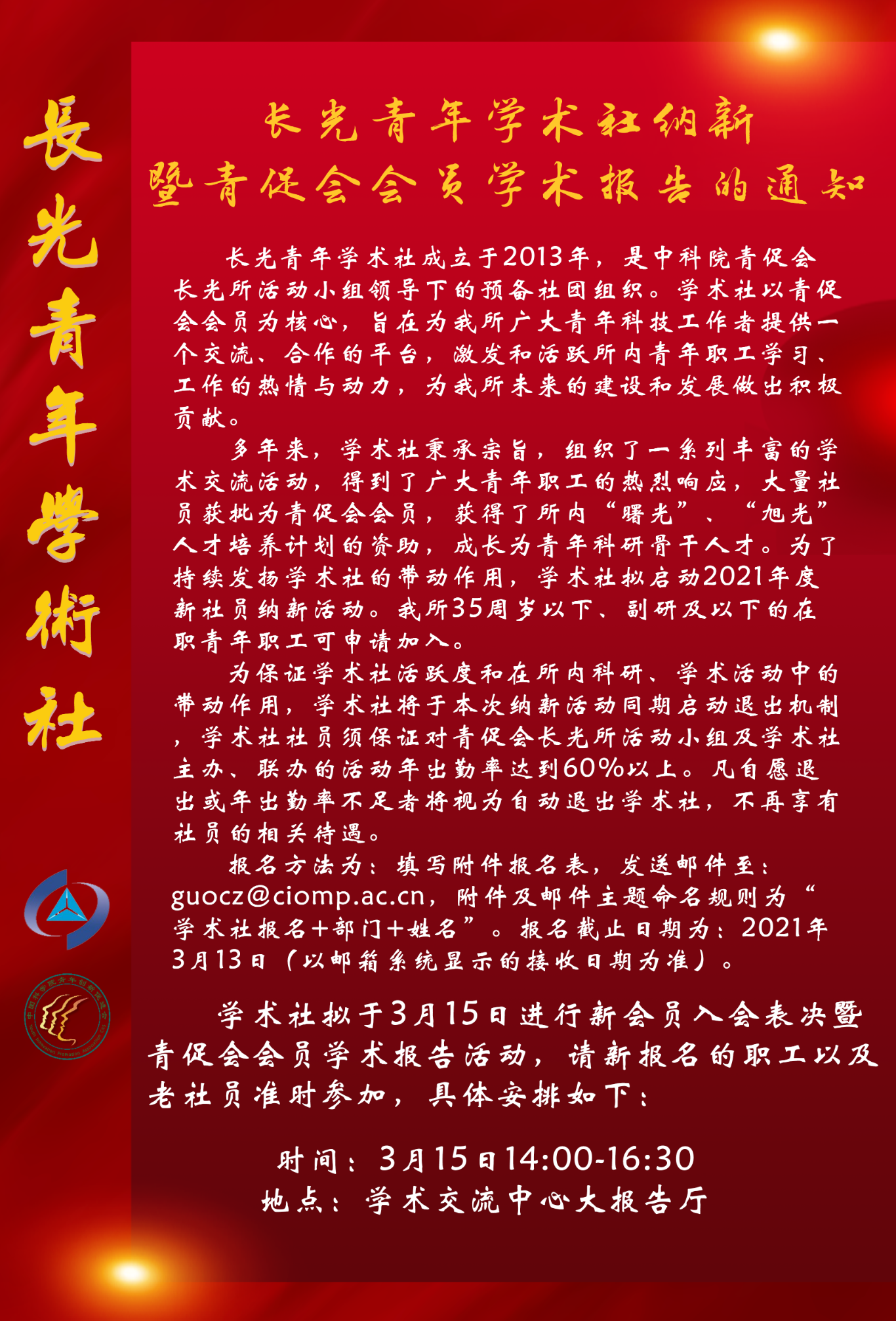 多年来,学术社秉承宗旨,组织了一系列丰富的学术交流活动,得到了广大青年职工的热烈响应,大量社员获批为青促会会员,获得了所内“曙光”、“旭光”人才培养计划的资助,成长为青年科研骨干人才。为了持续发扬学术社的带动作用,学术社拟启动2021年度新社员纳新活动。我所35周岁以下、副研及以下的在职青年职工可申请加入。。