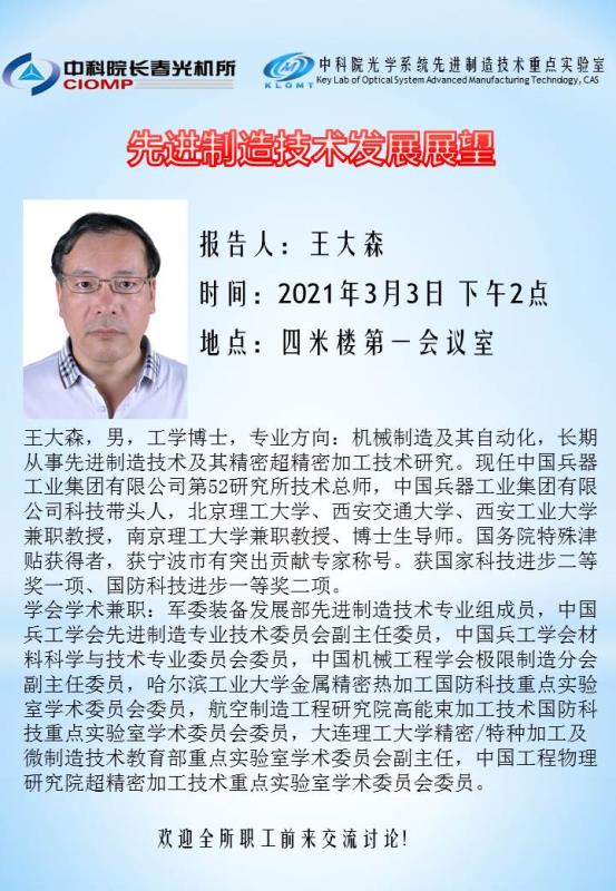 王大森,男,工学博士,专业方向:机械制造及其自动化,长期从事先进制造技术及其精密超精密加工技术研究。现任中国兵器工业集团有限公司第52研究所技术总师,中国兵器工业集团有限公司科技带头人,北京理工大学、西安交通大学、西安工业大学兼职教授,南京理工大学兼职教授、博士生导师。国务院特殊津贴获得者,获宁波市有突出贡献专家称号。获国家科技进步二等奖一项、国防科技进步一等奖二项。