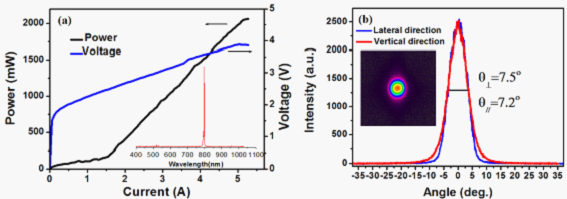 研究小组采用双边横向布拉格反射波导结构(如图1(b)),该结构通过光子禁带原理进行光学导波,所限制模式为光学缺陷模式,可以有效压缩激光的远场发散角。在成功解决了光子晶体缺陷模式与全反射模式竞争、高质量厚尺度(>10微米)外延生长技术问题后,实现了该器件室温连续激射。器件工作于808nm,输出功率>2W,斜率效率0.531W/A,快、慢轴发散角被降低到7.5o和7.2o,出光光斑近圆形 (如图2)。