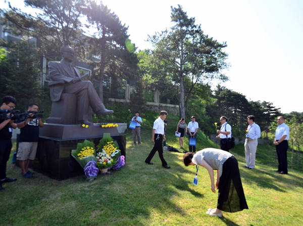 吉林新闻网长春7月8日电 (陈博宜 陈嘉龙)8日一早,一支支黄色的菊花敬献在有“中国光学之父”之称的王大珩雕塑前。这是长春光机所纪念王大珩诞辰百年举办的系列活动之一,旨在缅怀老一辈光学奠基人,鼓励更多年轻人从事光学事业。