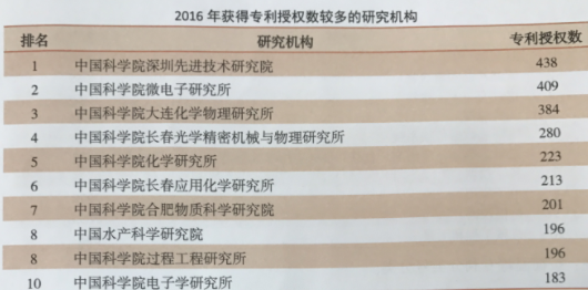 另外,长春光机所2016年获得专利授权280项,在所有研究机构中排名第4位(见图4)。排在前3位的研究机构分别为中国科学院深圳先进技术研究院(438项)、中国科学院微电子研究所(409项)和中国科学院大连化学物理研究所(384项)。