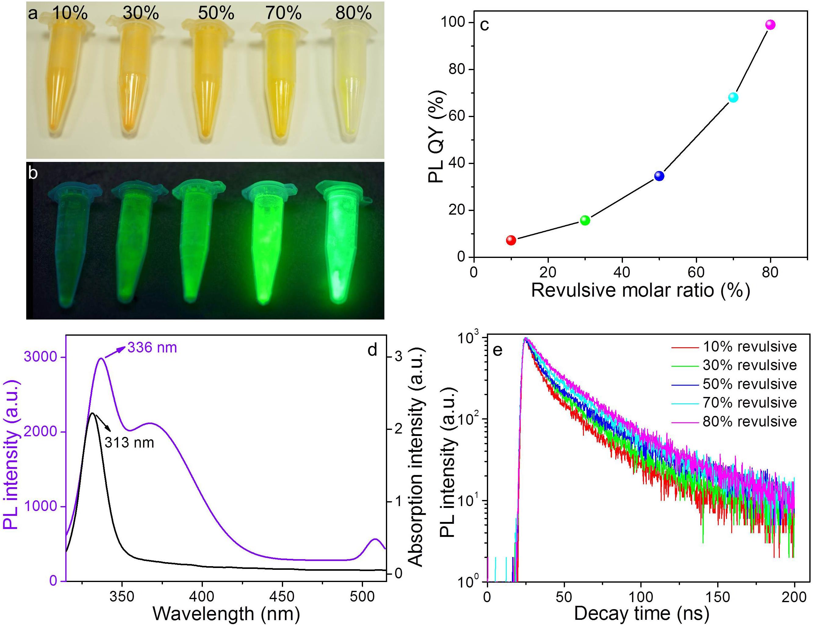不同比例ZnBr2诱导剂作用下CsPbBr3和Cs4PbBr6钙钛矿纳米晶在自然光(a)和紫外灯照射下(b)的照片、荧光量子效率(c)和荧光寿命(e);Cs4PbBr6钙钛矿纳米晶的吸收以及荧光发射光谱(d)