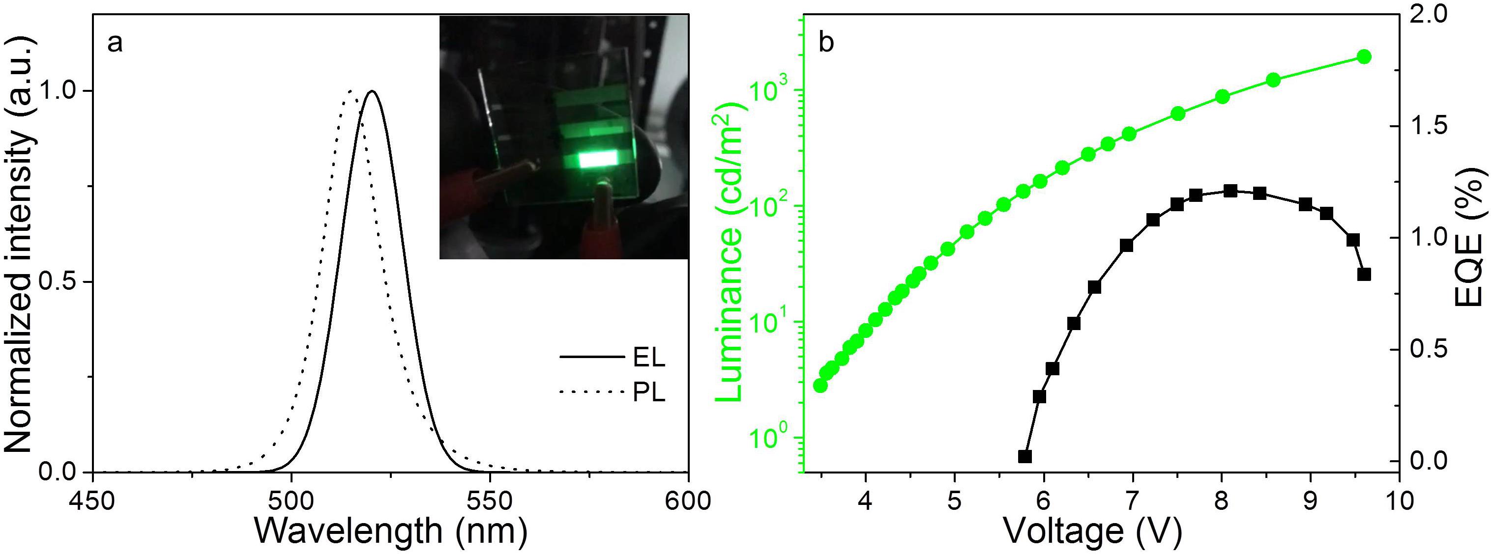 (a)钙钛矿量子点做成LED器件前后的荧光发射光谱和器件照片结果