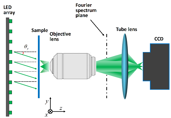 傅里叶叠层成像(FPM)是近年提出的一个可以获得大视场、高分辨率图像的测量方法。FPM的装置类似光学显微镜,只是将光源替换成一个LED阵列,通过按特定顺序点亮单个LED照明时在相机端获得一系列低分辨率(LR)图像,由于不同低分辨率图对应着样本频谱中的特定子区域,故可以通过优化算法在频域中将低分辨率图片的信息进行融合,获得超出系统物镜极限分辨率并保留其原有视场的高分辨率振幅和相位图片。