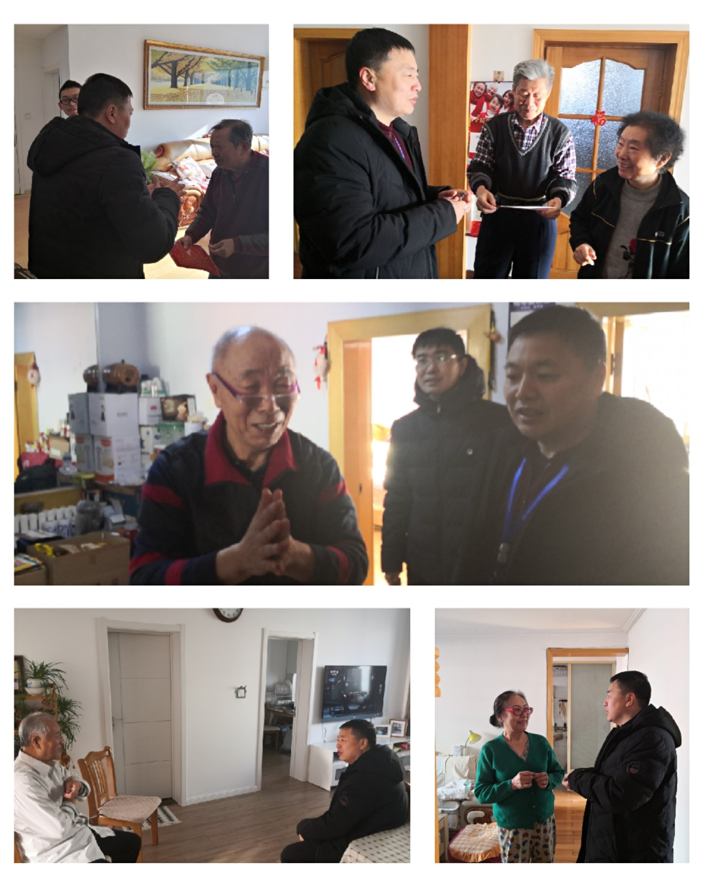 在走访的过程中,慰问组成员与老同志们亲切交谈,共同回忆了在质检中心工作的日子,聆听了老同志们分享当年奋斗的历史,深刻的体会到了老同志们的科研奋斗精神。每到一户,中心领导都详细的了解各位老同志们的身体状况和平时生活情况,向老同志们讲述这些年中心发展的概况,代表质检中心感谢他们曾经对中心发展所做出的巨大贡献,真心祝愿他们春节快乐,晚年幸福。