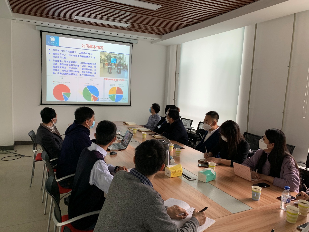 王小东就目前疫情形势下长光华大所处的大健康领域的机遇和挑战进行了分析,并对企业运营积极出谋划策。其他陪同调研人员也就各自分管领域与长光华大相关人员进行了充分交流。