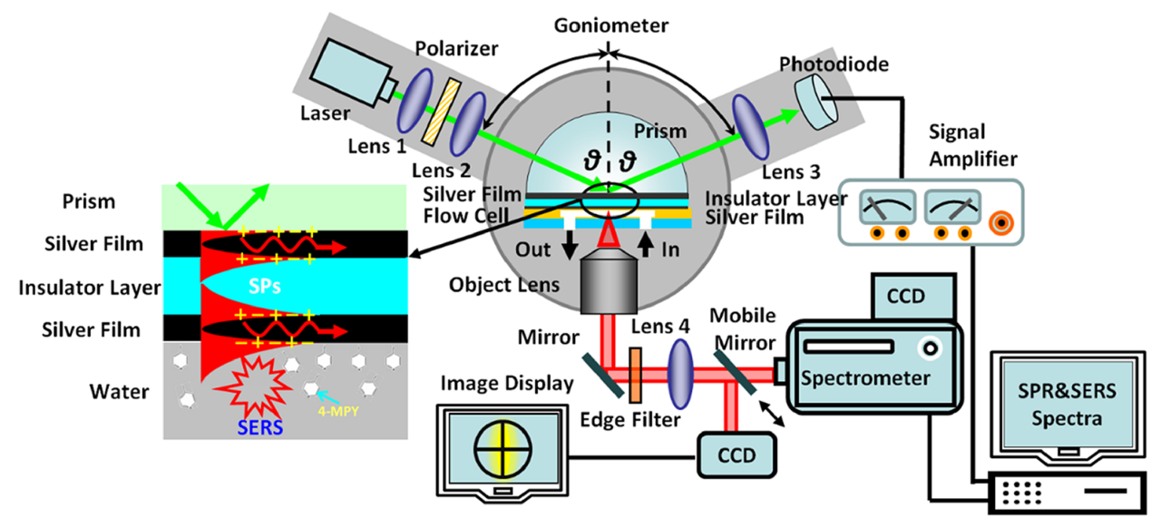 在长春光机所曙光计划及应用光学国家重点实验室自主基金的支持下,刘钰等构建了一套能够同时测量表面等离子体共振(SPR)信号以及表面增强拉曼散射(SERS)信号的SPR-SERS显微拉曼光谱仪。该工作中的SPR-SERS显微拉曼光谱仪,以表面等离子体共振为基础,集成SPR技术与SERS技术,可以同时检测同一微区的SPR信号以及SERS信号,同时获得金属表面生物分子相互作用时的SPR曲线,以及金属表面生物分子相互作用前后SERS光谱信息,用于实时、原位的分析生物分子相互作用时的外在变化以及生物分子内在结构的变化,将物理学、化学、分析科学以及工程技术等优势结合起来,易于发展新型的多维表面增强光谱检测和传感技术。