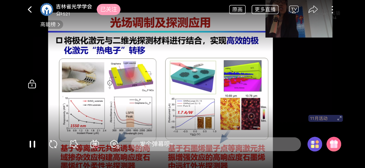 11月18日,应用光学国家重点实验室学术论坛第十期暨吉林省光学学会“集光荟”第四期科普讲座隆重举行,本次活动邀请到2020年度国家优秀青年科学基金获得者李绍娟研究员做了题为“二维材料的光电性质调控及光探测应用”的学术报告。本次活动得到了广泛关注与热烈响应,线上线下精彩纷呈,为广大光学科研工作者和爱好者创造了一个与顶级青年科学家交流互动的机会。