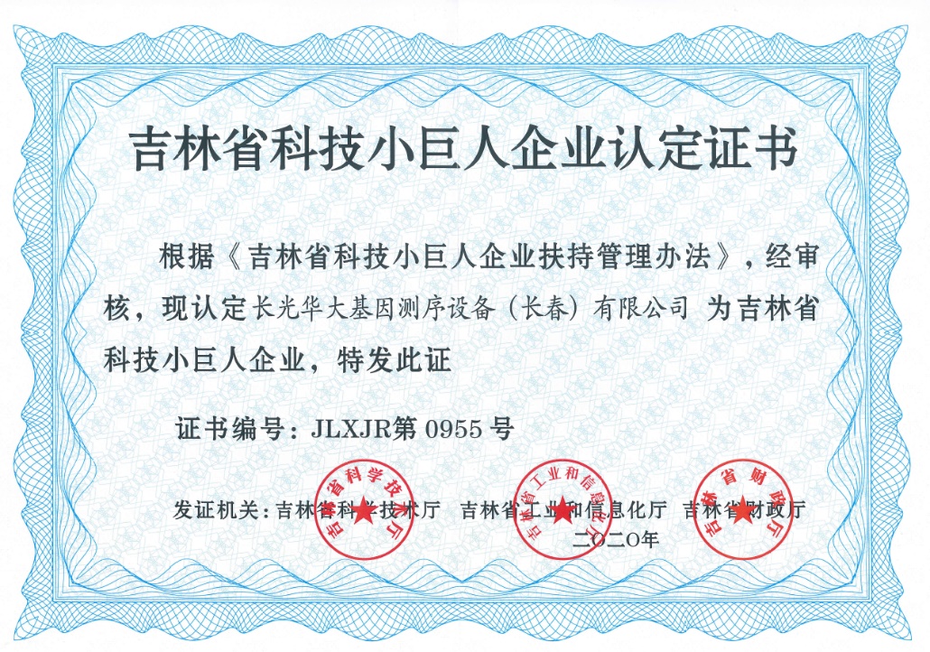 吉林省科技小巨人企业认定证书