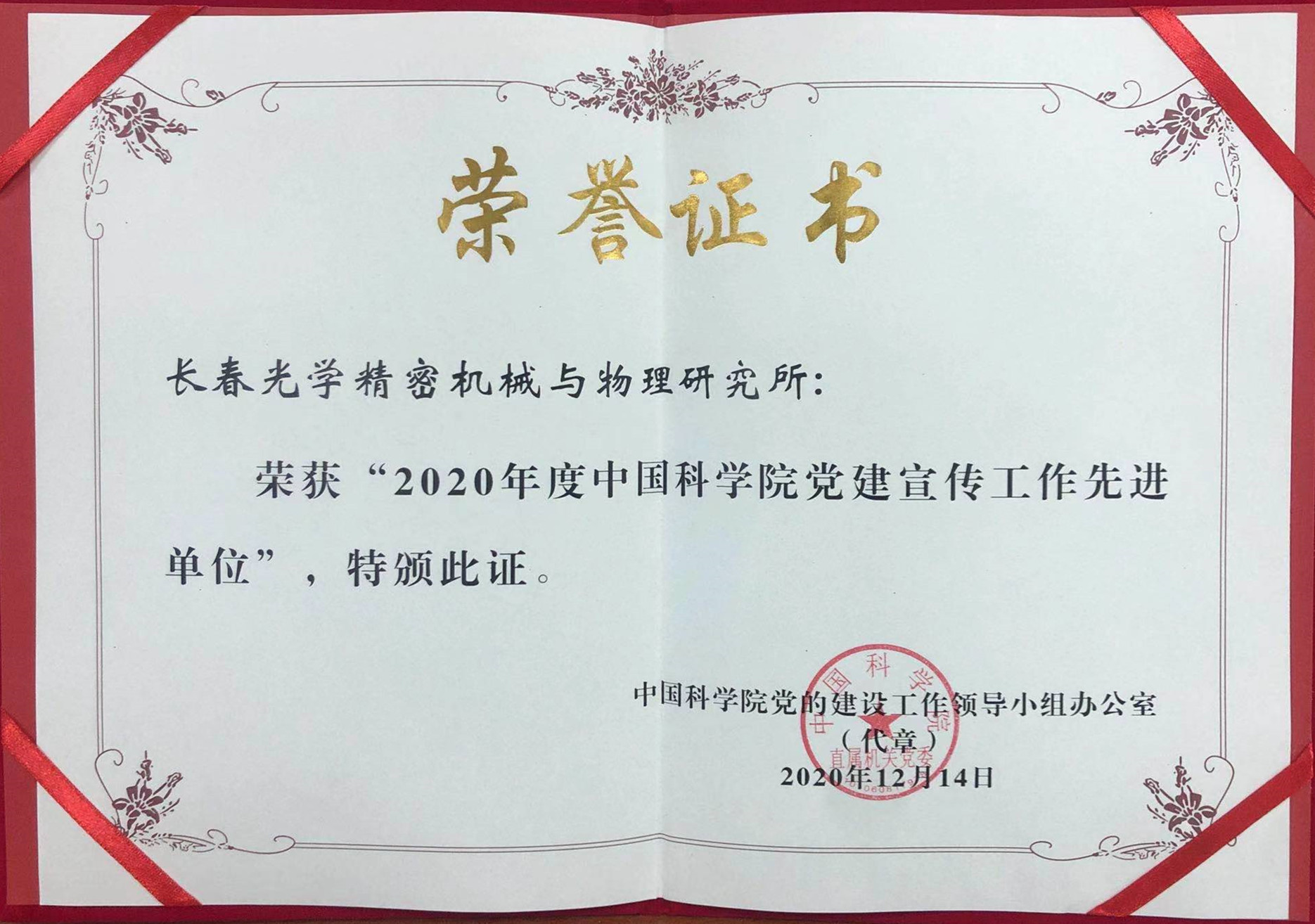 中国科学院党的建设工作领导小组办公室近日印发了《2020年度中国科学院党建宣传工作统计综合得分情况通报》,对荣获2020年度中国科学院党建宣传工作先进单位进行了表彰。长春光机所荣获2020年度中国科学院党建宣传工作先进单位称号。