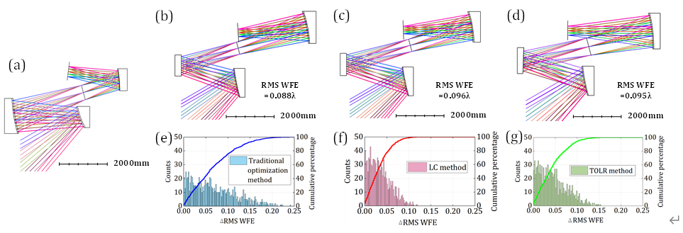 在仿真验证过程中,研究人员对一个大视场自由曲面离轴三反光学系统进行优化设计,将课题组提出的LC优化方法与传统设计方法(只优化成像质量)和ZEMAX光学设计软件内置TOLR降敏方法进行对比。公差分析的统计结果显示,课题组提出的LC方法可以在10分钟内获得光学系统误差敏感度降低51%的优化结果,而TOLR方法经过18个小时的优化,也只能获得误差敏感度降低21%的结果。