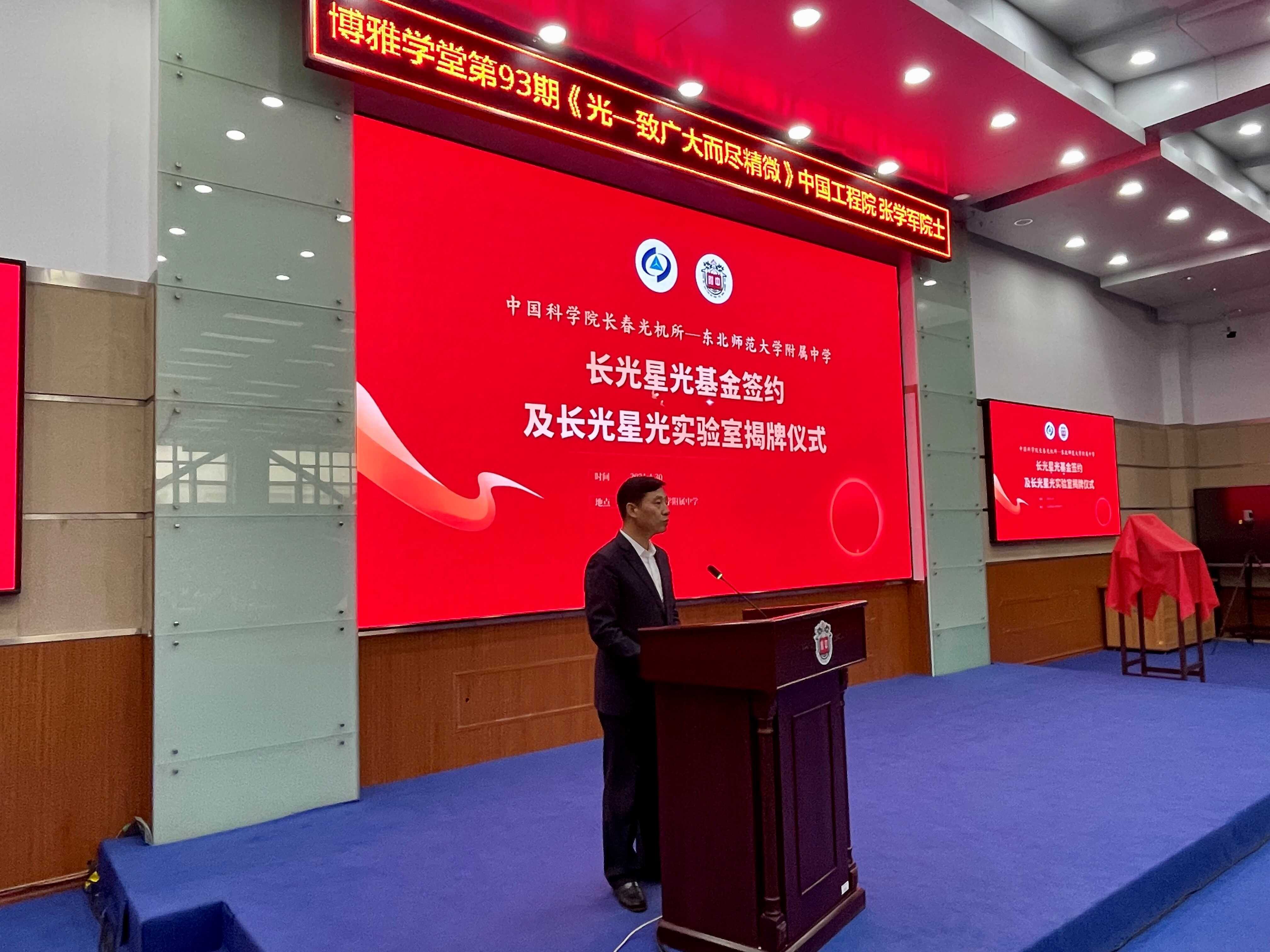 4月30日,中国科学院长春光机所与东北师范大学附属中学签约授牌仪式暨院士报告活动在东北师范大学附属中学报告厅成功举办。东北师范大学校长、党委副书记徐海阳,东北师范大学附属中学校长、党委副书记邵志豪出席并致辞,中国工程院院士、中国科学院长春光机所所长张学军讲话并作报告,中国科学院长春光机所党委副书记、纪委书记孙焕,副所长孙守红以及东北师范大学附属中学400余位师生出席本次活动,活动由东北师范大学附属中学党委书记刘丽君主持。