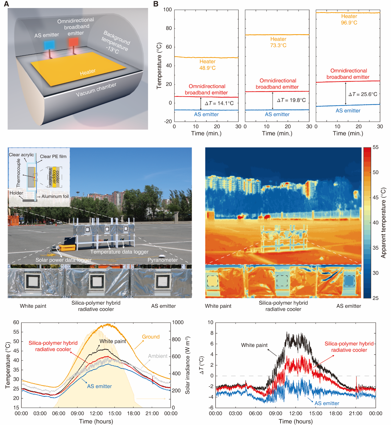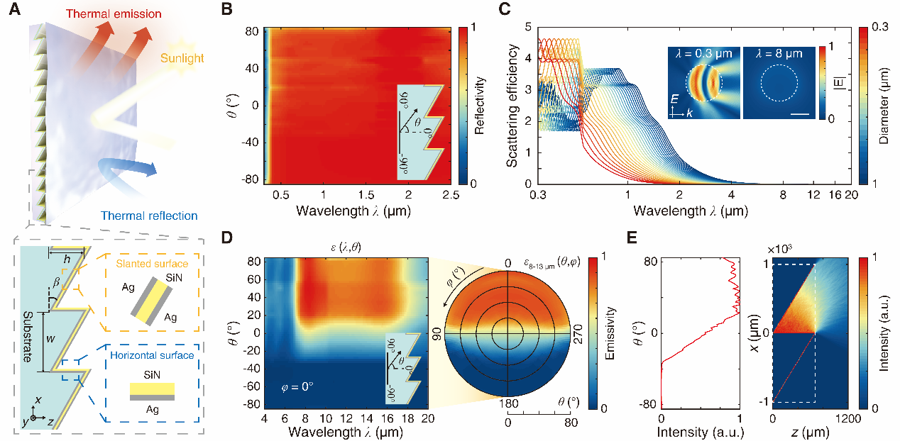 以辐射制冷为例,过往的辐射制冷器件通常呈现出全向的热辐射特性,因此仅适用于开阔的水平表面(如屋顶),以便最大限度的面向温度较低的天空,并尽可能的隔绝器件与地面、周围物体、大气非透明窗口波段向下辐射等的热量交换。然而,当它们被用于竖直表面(如墙面、衣物、车辆侧面等广泛实际场景)时,器件面向低温天空的视场角显著缩小,同时不得不大量吸收地面(尤其在亟需制冷的夏日,地表温度远高于环境温度)、周围物体以及大气非透明窗口波段向下辐射等的热量,从而导致其亚环境辐射制冷失效。尽管近年来一些国际研究团队尝试调控热辐射的光谱或角度,但竖直表面的日间亚环境辐射制冷仍然面临着巨大的挑战。