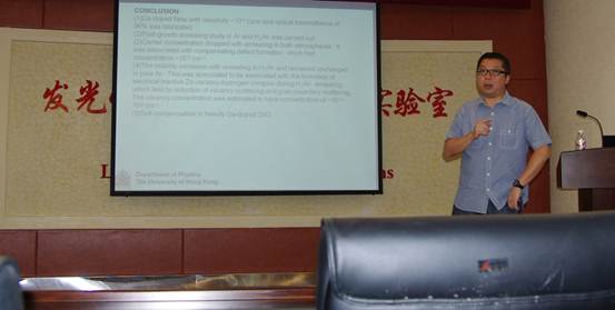 在报告中,LING Chi-Chung副教授系统地介绍了As掺杂和Ga重掺杂ZnO缺陷的形成与表征方法,以及热处理对掺杂ZnO导电性,施主、受主的影响,并针对ZnO掺杂中存在的难点问题同与会人员进行了交流讨论。