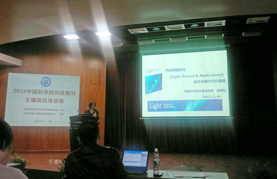 11月1日-8日,期刊编辑部参加了由中国科学院自然科学期刊编辑研究会主办、中国科学院上海生命科学信息中心承办的“2013中国科学院期刊主编岗位培训班”,该培训被列入《新闻出版总署(国家版权局)2013年干部教育培训计划》,参加人员为各期刊的社长、总编辑、主编、编辑部主任及相应职务人员。我所信息中心副主任白雨虹研究员受邀作了题为“开放获取新刊《Light: Science & Applications》的办刊理念与价值观”的报告。报告对《Light》在仅创刊一年多即被SCI收录的原因进行了分析:一是选择享誉国际的出版机构—NPG出版集团作为出版平台;二是选择开放获取这一国际期刊主要发展趋势;三是建立了国际化的编委队伍、审稿专家队伍、作者队伍等。办刊理念决定期刊的发展方向,《Light》本着为读者办刊的理念,致力于发表高学术水平文章,搭建国际一流的平台,使期刊的学术交流功能真正融入科研,让中国科研人员发出更多的光学好声音。