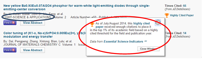图为获奖文章在SCI数据库中的截图,以奖杯标注