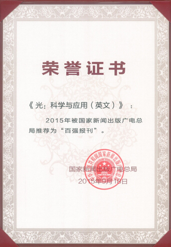 根据国家新闻出版广电总局《关于公布2015年“百强报刊”推荐结果的通知》(新广出发[2015]56号),长春光机所主办的期刊Light: Science & Applications(《光:科学与应用》,简称Light)入选2015年全国“百强报刊”,并在9月18日召开的2015中国(武汉)期刊交易博览会主题活动之一:“全国百强报刊”新闻发布会上与《光明日报》、《读者》分别作为百强报纸、百强社科期刊及百强科技期刊的代表在大会发言。这是Light获得的首个国家级荣誉称号。