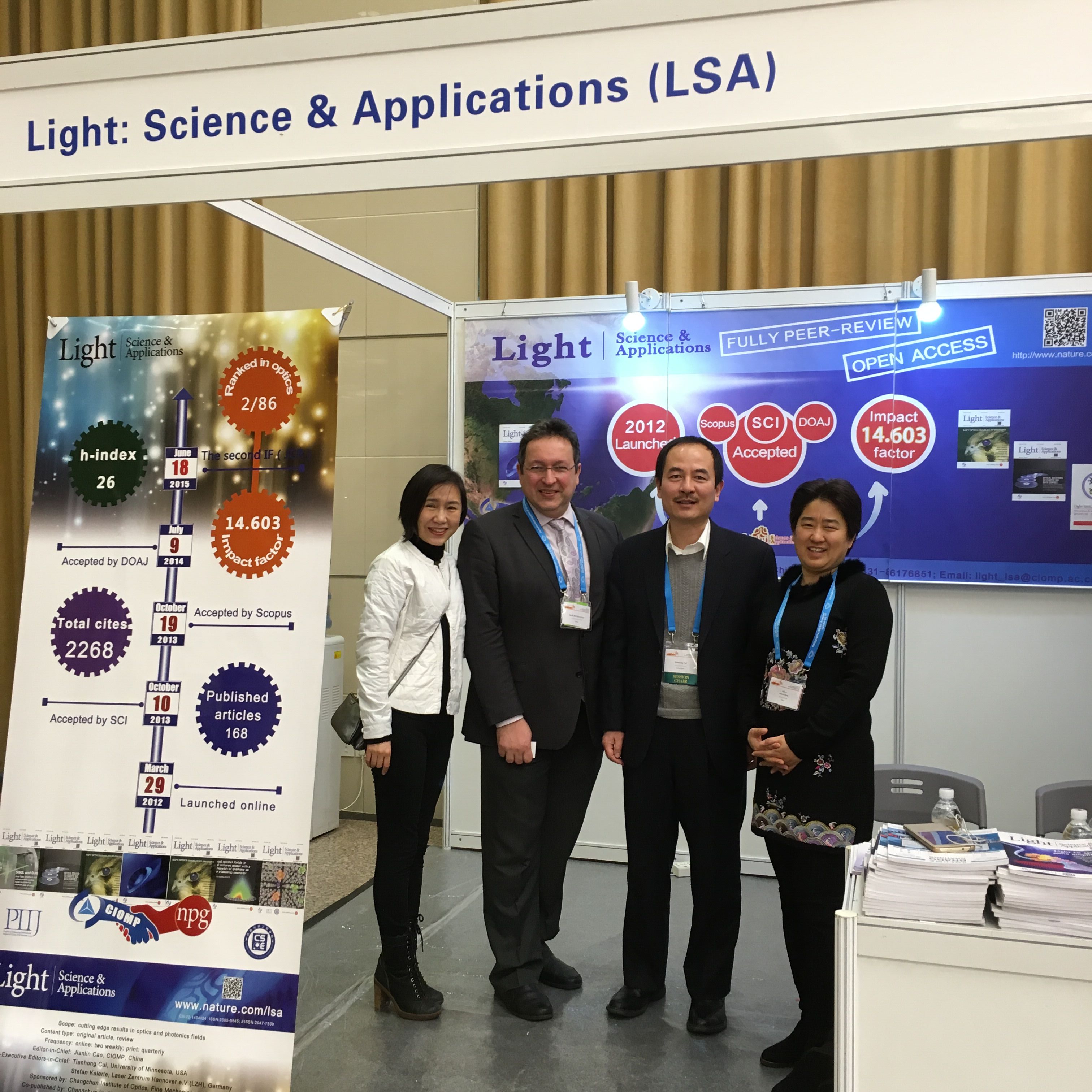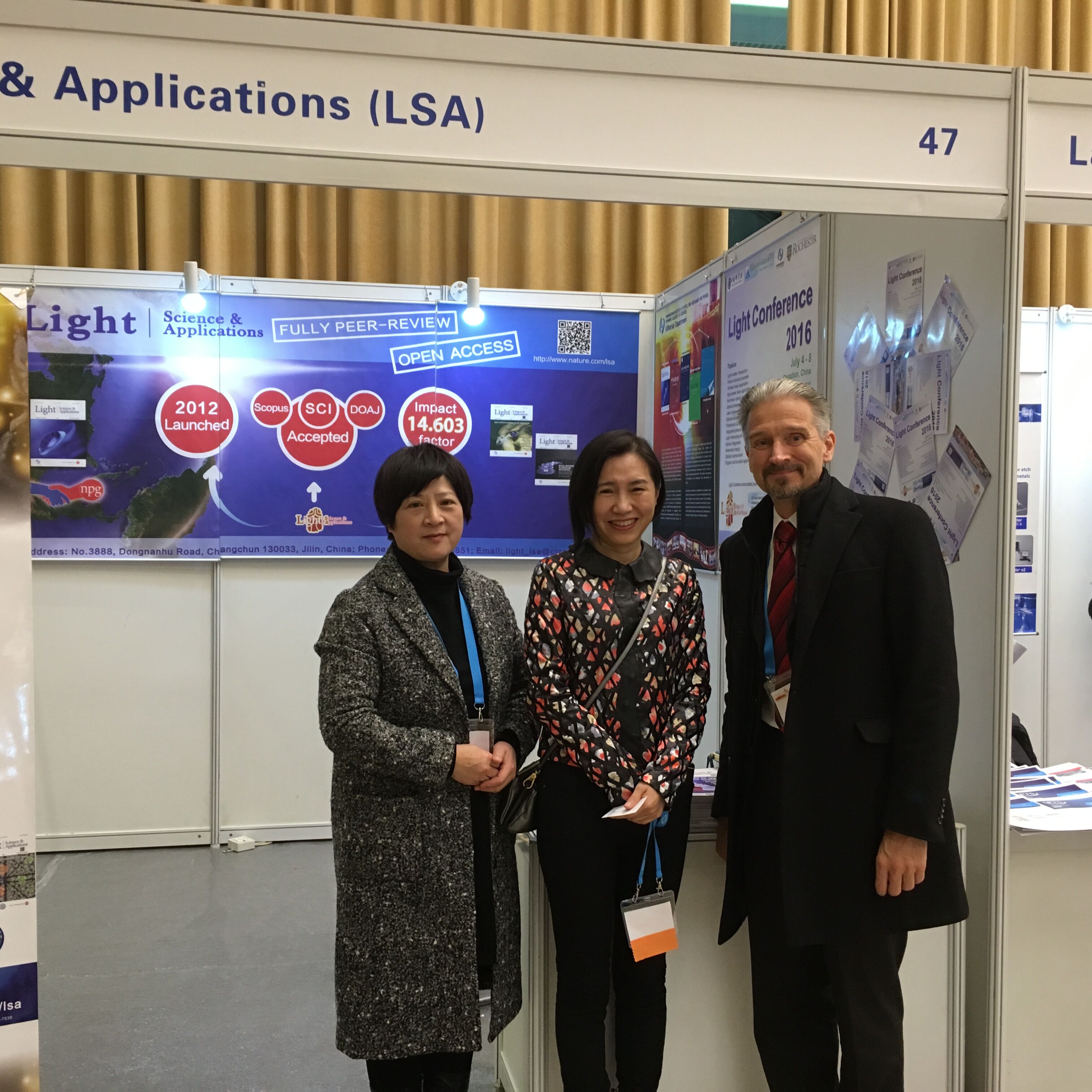 长光所编辑部受本次会议主席清华大学王晓红教授的邀请,作为本次会议的媒体支持,携长光所主办的五种期刊参加这次国际会议,借助展位平台,通过赠阅期刊、海报展示等方式对《Light: Science & Applications》(简称:《Light》)、《中国光学》、《光学精密工程》、《发光学报》和《液晶与显示》期刊进行了宣传,重点对light期刊的定位、发展现状进行了介绍以及对即将举行的Light Conference 2016进行了推介,得到了与会代表的广泛关注,会议主席斯坦福大学的O. Solgaard等知名专家表示愿意为light撰稿。