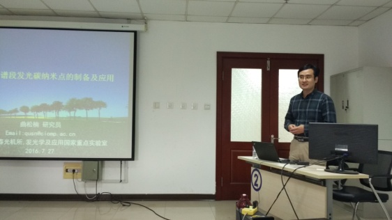 曲松楠研究员详细汇报了其在碳纳米点领域所取得的成果,从最初通过微波炉法制备碳纳米点,到实现碳纳米点在可见区全谱段发光,再到碳纳米点新功能的开发。结合这些突破,曲松楠研究员总结了他对基础科研中创新的认识,即在掌握基本知识的深层机理的基础上,发现其新功能、新应用。