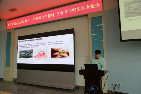 报告会首先由吴文明博士为大家带来以《在学习中成长》为题的精彩报告。吴文明博士在2008至2016年,曾在海外多所科研院校深造、研究;2015年他获得教育部颁发的国家优秀留学生奖;2017年加入长春光机所。报告中,吴博士向大家讲述了他本科毕业后,转变专业、从事微机电(MEMS)工程以及微流控领域前沿研究的经历。在面对专业方向的巨大变化时,吴博士没有畏缩不前,而是选择潜心专研,从细微的科学现象中发现研究的突破口,并逐步打开研究局面,最终研究成果得到国际著名学术同行高度评价,并且具有很强的应用转化价值。报告中,吴博士还介绍了在决定回国之后,自己选择来到长春光机所的心路历程。他回忆曾经在应用光学国家重点实验室有一次让他非常感动的座谈会。当时,所党委领导和年轻同志一起回忆实验室艰辛的发展历程,当提到曾经因为发展停滞、很多人纷纷离所、只有少数人继续坚持下来,最后重振应光室辉煌时,领导和同事们纷纷落泪。这一幕让他非常感动,始终记忆犹新。他深刻的感受到今日长光人对长春光机所的深情厚爱,也深深体会到长光人不屈不挠、勇于开拓创新的精神。这也是他最终选择来到长春光机所的原因。