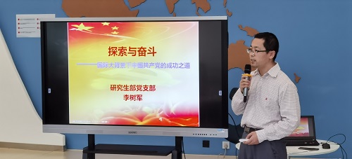 研究生部党总支书记李树军为大家做了题为《探索与奋斗——国际大背景下中国共产党的成功之道》的主题报告。报告从世界历史和国际关系的维度,分析了中国共产党如何孕育而生。中国共产党成立之后,又是如何发展壮大,经历了艰难曲折而始终信仰不悔,带领全国人民历经二十八年艰苦卓绝的斗争,建立了伟大的新中国。