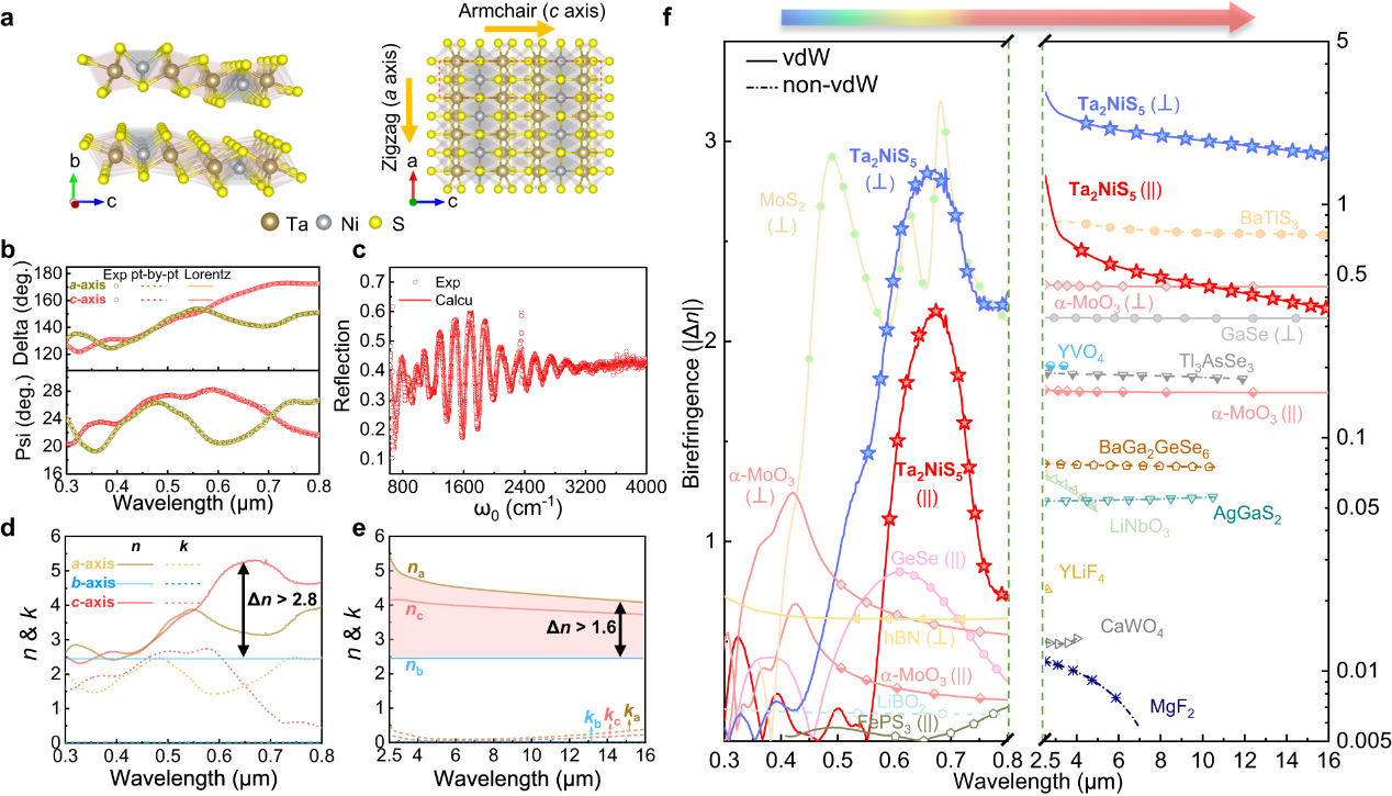 研究团队首先从结构各项异性和电子极化率两方面出发寻找可能支持巨大面内双折射的晶体,通过第一性原理计算、远场椭偏测试、傅里叶变换红外光谱测试和近场测试相结合的方法揭示了双轴范德华晶体Ta2NiS5从可见光到中红外(0.3-16μm)超宽带、低损耗、巨大的双折射,在可见光和中红外波段面内双折射Δn≈2和0.5,创造了已报道的范德华晶体中面内双折射的新纪录。