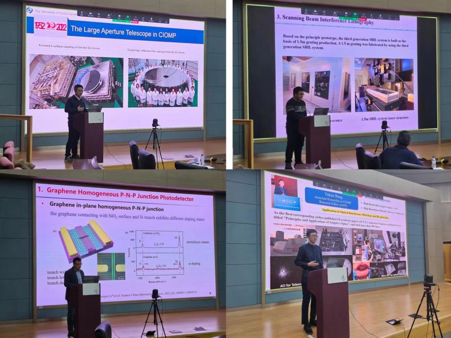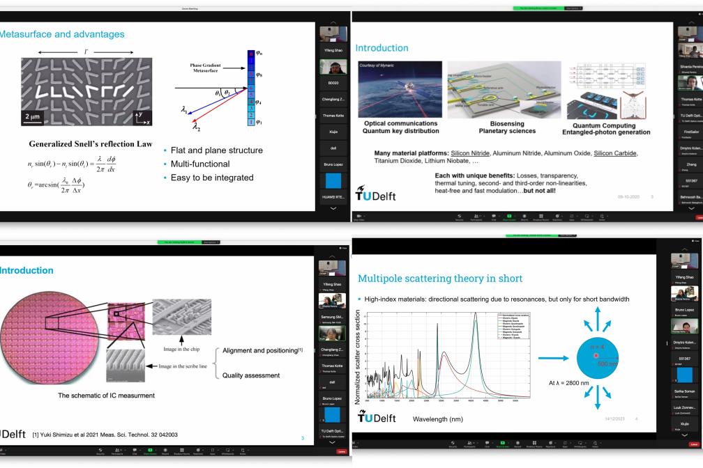 会议上半场,来自长春光机所的光学系统先进制造重点实验室的白杨博士、王玉坤博士和微纳光子学与材料国际实验室的Gopal Verma博士以及荷兰代尔夫特理工大学的Zheng Zhu博士、Wenye Ji博士、Xiujie Dou博士分别介绍了他们在光学领域取得的研究进展。会议下半场,来自长春光机所光学系统先进制造重点实验室的王彬博士、王延超博士和光栅技术研究中心的刘林博士以及代尔夫特理工大学的Bruno López Rodríguez博士、Yifeng Shao博士和Thomas Kotte博士分别分享了各自在光学领域的成果。