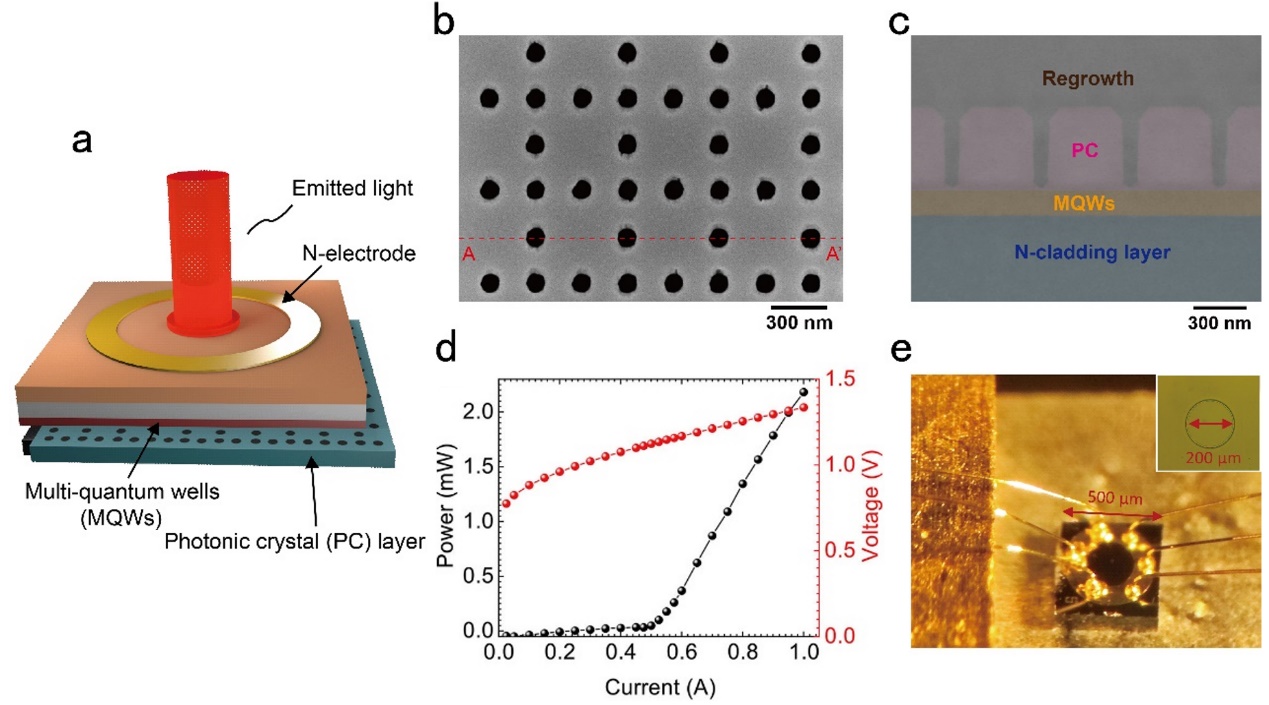 PCSEL是目前半导体激光器领域所关注的重要研究方向,可广泛应用于通信传输、激光泵浦、光学传感、医疗设备等多个技术领域,被行业著名头部公司定义为核心根技术。然而,受限于大的器件尺寸和高的阈值电流,当前PCSEL尚不能满足高速光通信等领域的实际应用需求。该工作首次提出用三晶格光子晶体结构来增强谐振腔内的光反馈,并在其基础上制备了工作在1.55μm波段的InP基连续电泵浦PCSEL,为缩小光子晶体腔尺寸、降低器件阈值提供了新途径,未来将在高速光通信、激光雷达等应用领域有着重要作用。