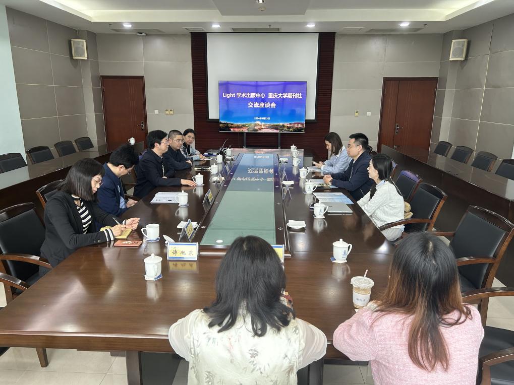 在重庆大学期刊社,Light中心张莹一行参加了重庆大学期刊社举办的双边交流会。重庆大学期刊社社长袁文全、副社长王维朗、副总编钟小伟等出席了本次交流会。袁文全与张莹分别介绍了重庆大学期刊社与Light中心的发展历程。随后,双方代表就优化科技期刊工作流程与管理机制、办刊困难与挑战、人才引进与培养、未来双方合作契机等问题进行了探讨。