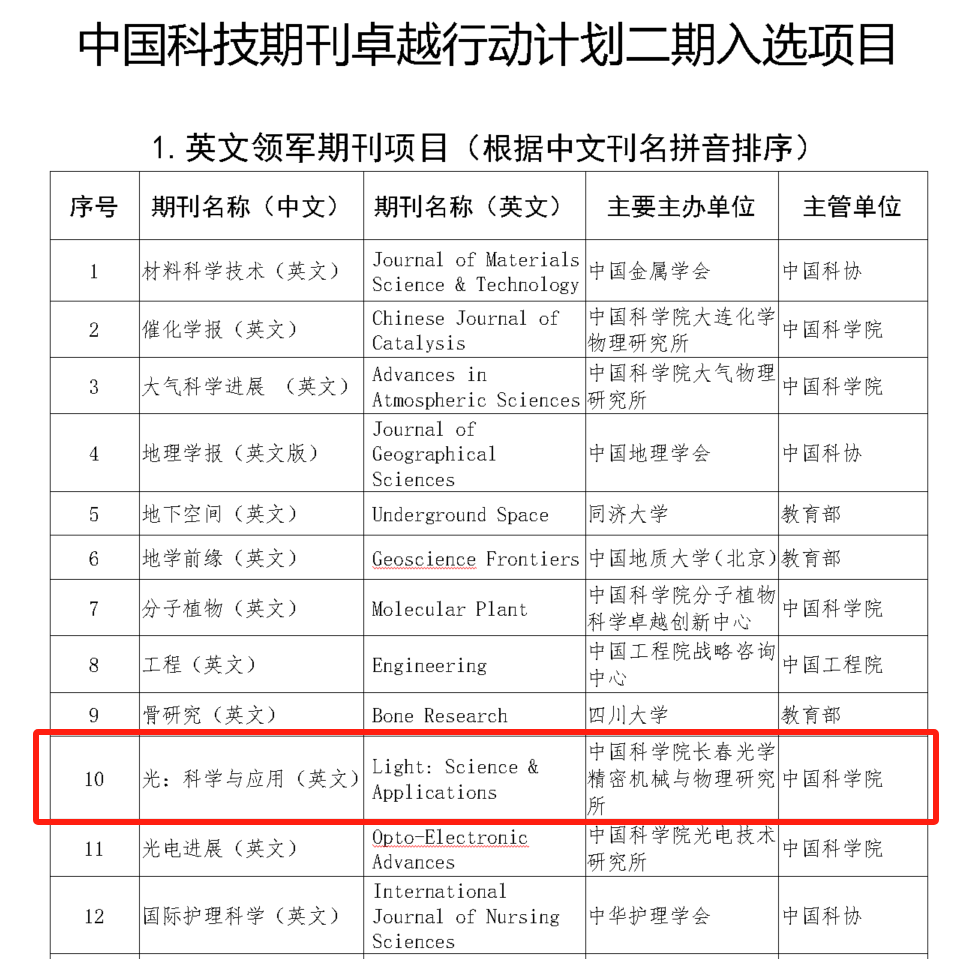 Light期刊在卓越行动计划一期以优秀成绩结题后,再次蝉联英文领军期刊,这不仅是对Light期刊学术品质与影响力的高度认可,更是其坚持追求卓越的见证。而作为Light品牌的冉冉新星,eLight跻身英文梯队期刊,为Light集群增添了璀璨新光。与此同时,《光学精密工程》凭借稳扎稳打的发展步伐,成功入选中文梯队期刊,用实力诠释了匠心精神。