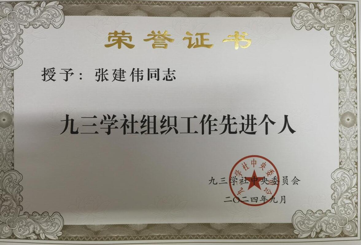 近日,九三学社中央委员会发布表彰决定,我所九三学社委员会主任委员、研究员张建伟荣获“九三学社组织工作先进个人”称号。