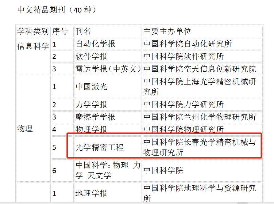 《光学精密工程》入选中国科学院中文精品期刊截图