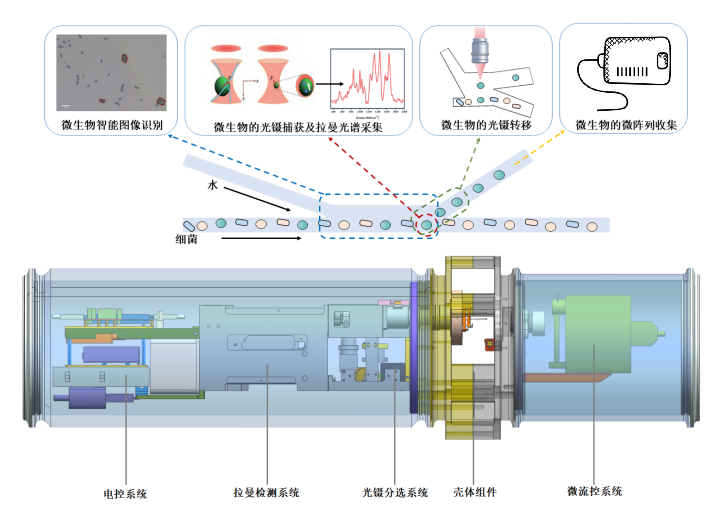 项目团队基于拉曼、光镊及微流控技术研发了能够实时、快速地检测并分选深海微生物的仪器设备,突破了拉曼检测技术和光镊分选技术在1500米级深海的应用,实现了对深海微生物的拉曼检测与光镊分选,为国内外应对深海极端环境检测与分选深海微生物提供了新思路。