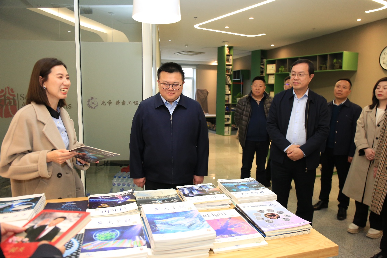 王鸣昊一行先后参观了研发大厦五楼办公区、Light学术出版中心、光栅展厅、大珩楼、光学系统先进制造全国重点实验室、光电产业园一期高新技术企业等本所重点科研平台与产业基地,听取了相关工作进展汇报,并与科研人员进行现场交流。