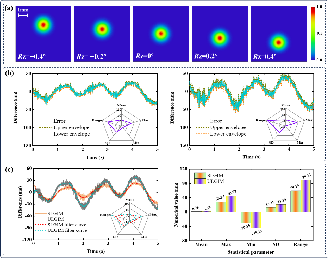 图2 研究亮点与实验结果(a)不同角度误差下两束干涉测量光在探测器表面的重合状态(b)100mm量程下SLGIM和ULGIM的误差分布(c)SLGIM和ULGIM的误差对比和统计学参数分析结果。