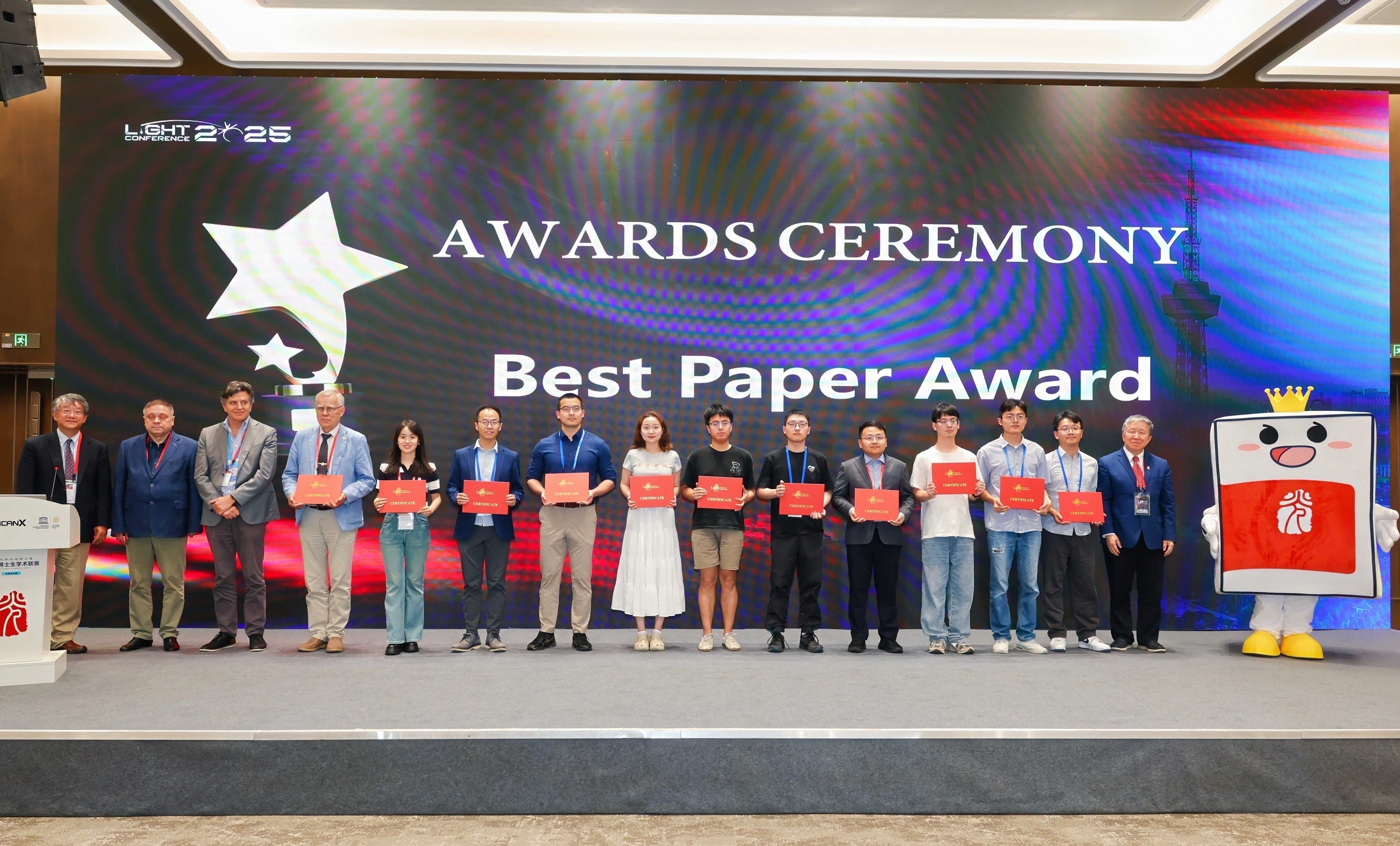 在闭幕式上揭晓了大会优秀论文奖与优秀海报奖并举行了颁奖典礼。 原科技部副部长、Light创刊主编曹健林,俄罗斯罗蒙诺索夫莫斯科国立大学教授Alexander Shkurinov,意大利国家研究委员会应用科学与智能系统研究所研究主任、教授、大会共主席Pietro Ferraro,中国科学院长春光学精密机械与物理研究所(以下简称长春光机所)所长、大会共主席张学军,美国西北大学讲席教授Manijeh Razeghi,波兰华沙理工大学教授Małgorzata Kujawińska,美国南佐治亚大学教授王笑军,中国科学院长春分院分党组书记、院长、长春光机所党委书记金宏,德国莱布尼茨汉诺威大学讲席教授、大会共主席丁飞,法国巴黎高等电子与电工技术工程师学院教授Tarik Bourouina,德国德累斯顿亥姆霍兹鲁森道夫中心教授Harald Schneider,广东工业大学教授秦玉文,瑞士洛桑联邦理工学院教授、大会共主席Luc Thévenaz,荷兰代尔夫特理工大学教授Paul Urbach,埃及艾因·沙姆斯大学教授Diaa Khalil分别为10篇大会优秀论文获奖者代表和30位优秀海报奖获奖者颁奖。