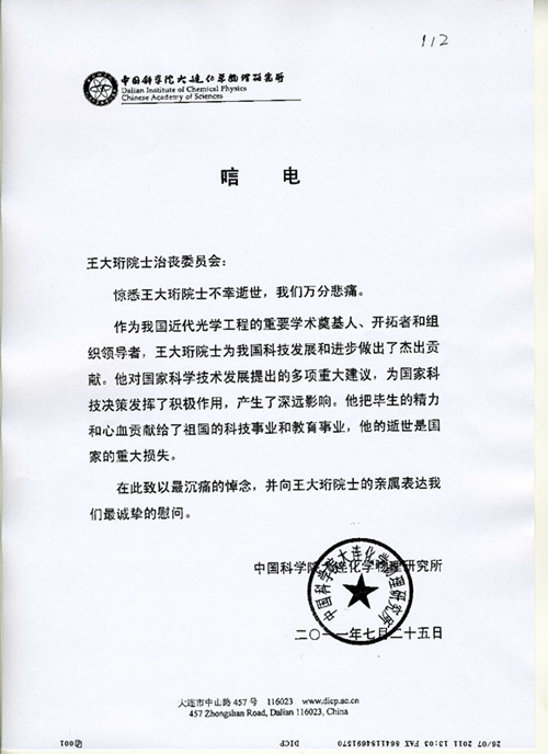 中科院大连化学物理研究所唁电