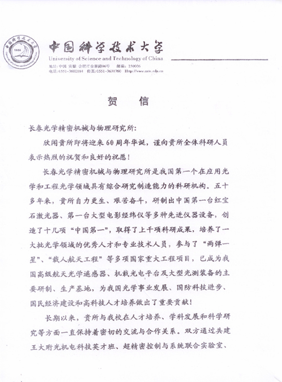 | 中国科学技术大学贺信 |