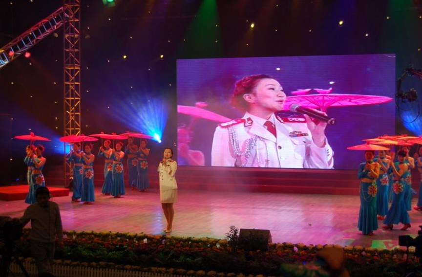 这种高清晰LED大屏幕即可配合舞台演出内容播放出预定的背景和场景(左上及下图),又可对演员演出内容进行现场放大(右上),方便现场观众的观赏。