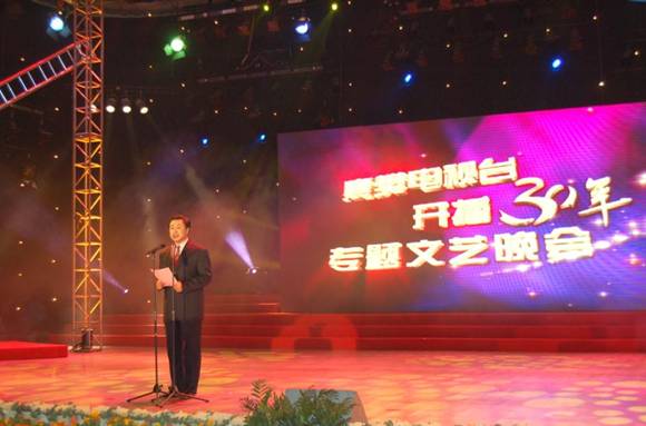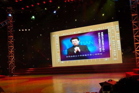 襄樊电视台的胡继明台长在进行30周年台庆及08年元旦的致辞(上图),作为背景的希达高清晰LED大屏幕实时播放出了经过精心制作的3D视频场景。