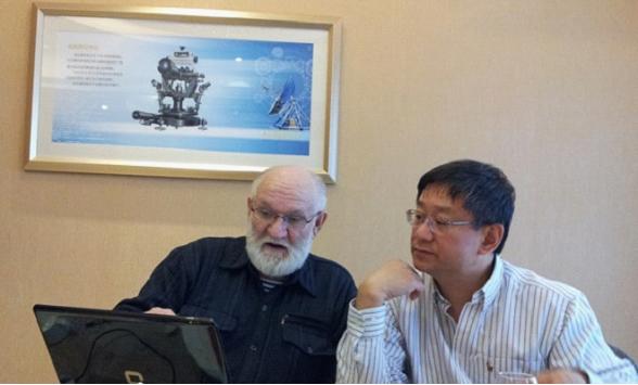张希成教授与长春光机所外籍特聘研究员、俄罗斯科学院西伯利亚分院大气生态研究所首席科学家Yury Andreev 教授讨论问题