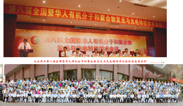 第八届全国暨华人有机分子和聚合物发光与光电特性学术会议于2013年7月31日至8月2日在长春隆重召开。本届会议是由中国物理学会发光分会主办,中国科学院长春光学精密机械与物理研究所发光学及应用国家重点实验室承办的系列性专业学术会议。会议云集了来自全国各地以及美国、日本、瑞典、中国香港和中国台湾等国家和地区的代表共计470多名,其中包括中国物理学会发光分会名誉主任范希武研究员,华南理工大学曹镛院士,南京工业大学校长黄维院士,清华大学副校长、科技部863计划“新型平板显示重大项目”专家组组长邱勇教授,中科院长春分院院长王利祥研究员,香港大学任咏华院士(美国科学院院士、英国皇家化学会院士、中国科学院院士),国际有机电致发光界领军人物—日本九州大学Chihaya Adachi教授等。
